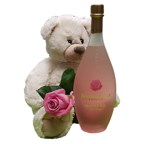 Grote witte knuffelbeer met roze roos en een heerlijke fles likeur Bocca di Rosa 0.5 L