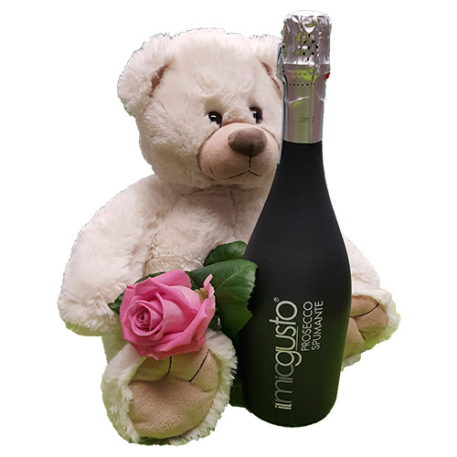 Grote witte knuffelbeer met roze roos en een lekkere fles Prosecco spumante
